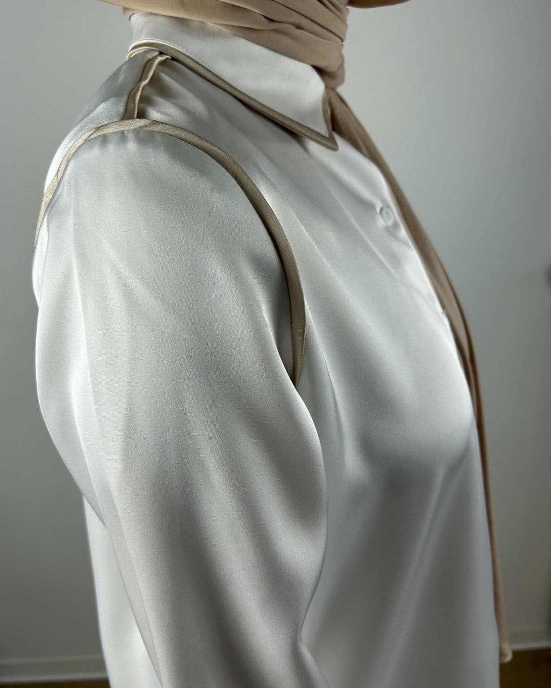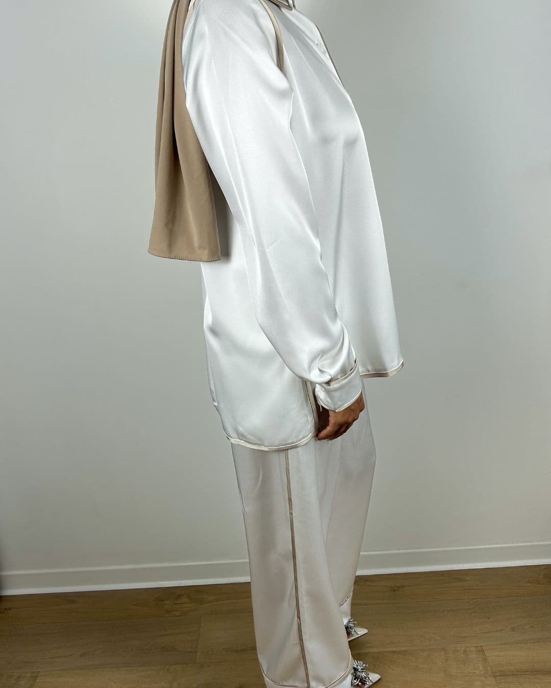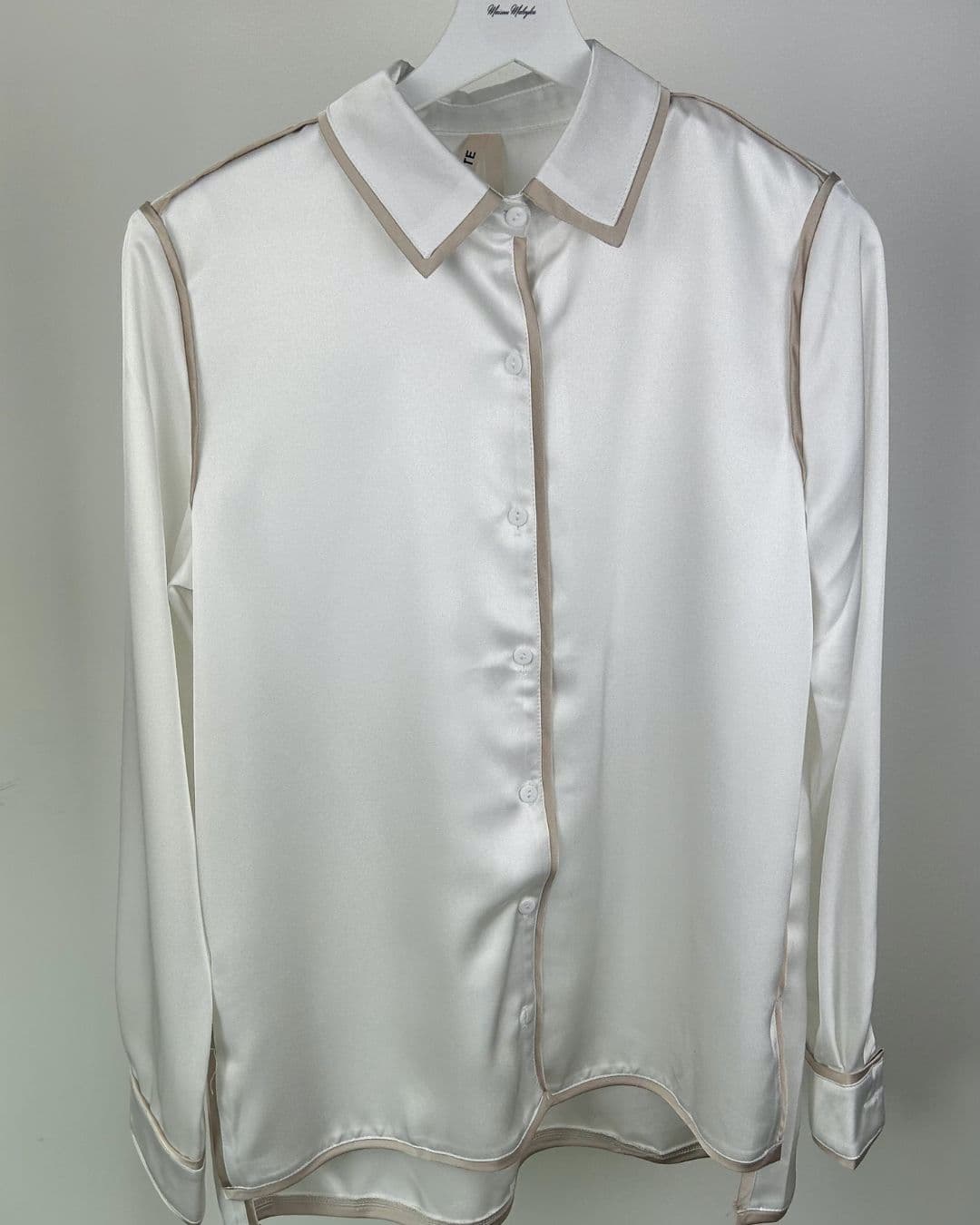 Élégante, fluide et subtilement brillante, cette chemise satinée blanc cassé incarne le chic minimaliste. Sa coupe droite, son tombé fluide et ses finitions beige contrasté en font une pièce forte, à la fois sobre et sophistiquée.