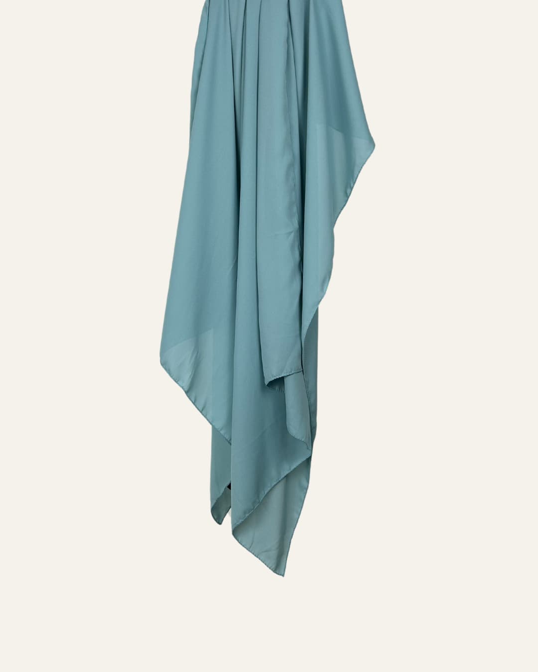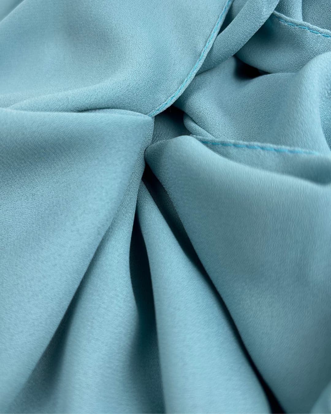 Léger, fluide et raffiné. Ce foulard en crêpe – teinte bleu/vert – évoque une fraîcheur subtile et un style singulier. Sa nuance entre ciel et mer apporte une touche originale, tout en restant sobre et élégante.